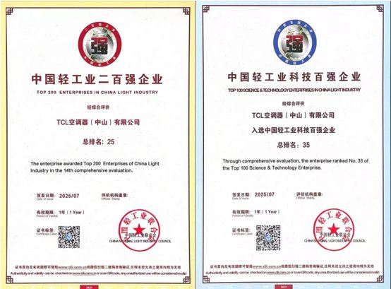 TCL空调荣登“中国轻工业科技百强企业”及“中国轻工业二百强企业”榜单